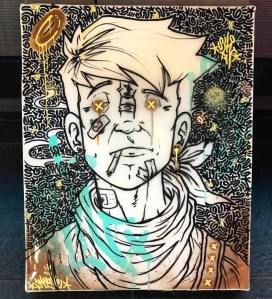 New York native, Ian Sullivan studied illustration at NYC’s Pratt Institute, but has tagged the city streets since the age of 12. Sullivan’s love of graffiti art is seen through his use of spray paint, acrylics, and ink to create cityscape murals, illustrations, and designs with hidden words, that capture the spirit of the city. Sullivan’s paintings are easily recognized by his unique style; a fusion of traditional and graffiti elements, and by a fictional persona known as SYN. As an alter ego, SYN has a sort of Holden Caulfield heroism; a poetic, profound character with a ‘bad boy’ facade navigating the cold streets of New York. This character study deconstructs the complexities of growing up in the world’s most unrelenting city.